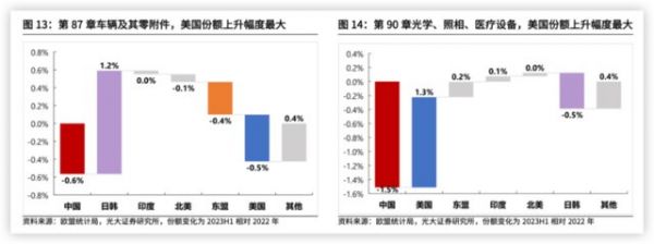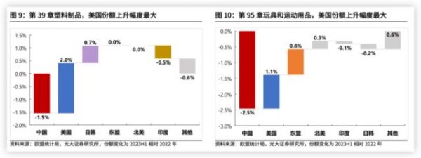 2)轻工制品类:份额替代较为集中,美国份额上升最多,东盟、日韩份额亦上升。