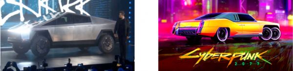 特斯拉皮卡(Tesla Cybertruck)(左)《赛博朋克2077》游戏中的汽车(右)