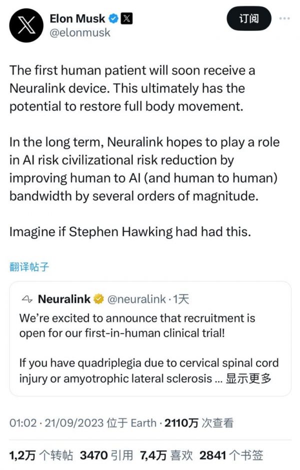 Neuralink在X(前推特)平台上宣布开启人体试验对象招募后,马斯克转发了消息,简短地表示“这最终可能恢复全身运动”,接下来却用更多字数写道:“从长远来看,Neuralink希望通过将人与AI(以及人与人)的带宽提高几个数量级,在降低AI风险方面发挥作用。”