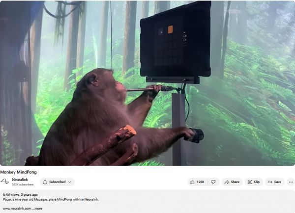 彼时,Neuralink已经成立5年,2019年进行了“首次猴体”试验,2020年进行了“首次猪体”试验。对外,Neuralink展示了猴子在脑机接口的帮助下,用“意念”拼出“我可以吃点零食吗”、打乒乓球,YouTube上的相关视频有不少点赞。