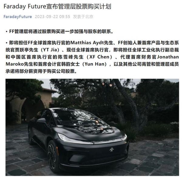 与此同时,FF 宣布了管理层股票购买计划,即将担任 FF 全球首席执行官的 Matthias Aydt、FF 创始人兼首席产品与生态系统官贾跃亭(YT Jia)、现任全球首席执行官,即将担任全球工业化执行副总裁和中国区首席执行官的陈雪峰(XF Chen)、代理首席财务官 Jonathan Maroko 和首席会计官韩韵(Yun Han),以及其他公司高管和管理层成员已自愿签署了一份薪资扣减和股票购买协议。