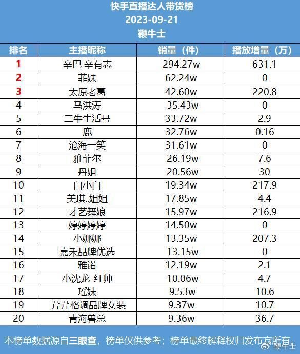 【直播带货日榜】是鞭牛士和三言科技推出的多个平台达人每日直播带货榜单。根据第三方数据平台“三眼查”提供的数据,鞭牛士将对快手、抖音平台的达人带货交易量、GMV、播放量进行统计和分析,以供各位从业者参考。