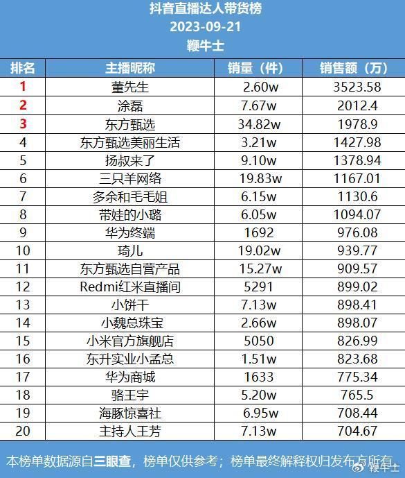 9月21日,抖音直播达人带货榜一是董先生,销售额3523.58万;榜二涂磊,销售额2012.4万;榜三东方甄选,销售额1978.9万。