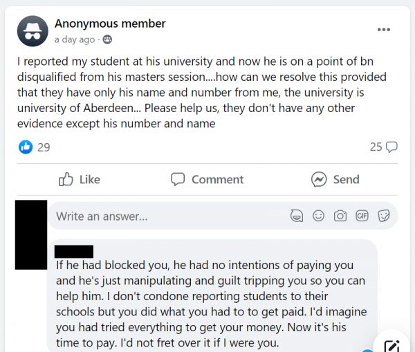 写手群里,隔三岔五就能看到有人问应不应该向客户的学校举报他们。这些帖子通常得到的建议都是算了,如果学生还需要再找他们代写往往会回来把上一次的钱结了。