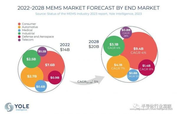 根据Yole Group近期发布的MEMS年度报告《Status of the MEMS Industry 2023》显示,MEMS市场将以5%的年复合增长率,从2022年的145亿美元增长到2028年的200亿美元。