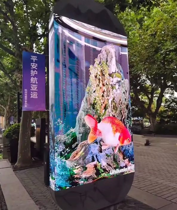 路边的电子广告屏也化身3D鱼缸,鱼翔浅底,惟妙惟肖。