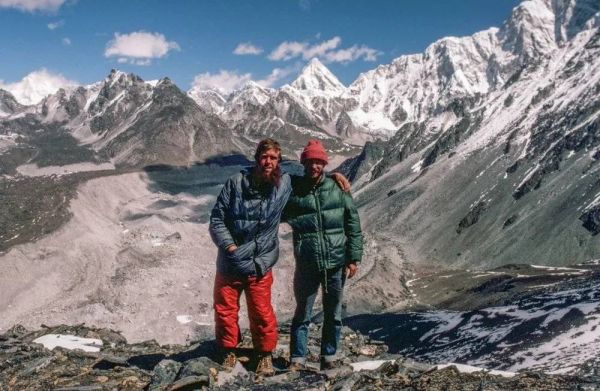 年轻时的凯文·凯利(左)与弟弟在登上珠穆朗玛峰5550米处时合影留念。(图/@Vanishing Asia)