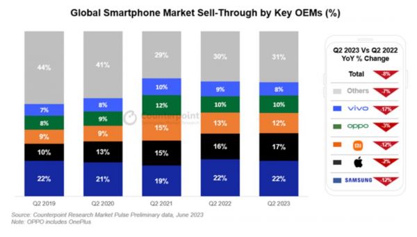 Counterpoint公布的数据显示,2023年第二季度,全球智能手机销量同比下降8%,环比下降5%。这已经是全球智能手机市场连续第八个季度处于下滑通道。