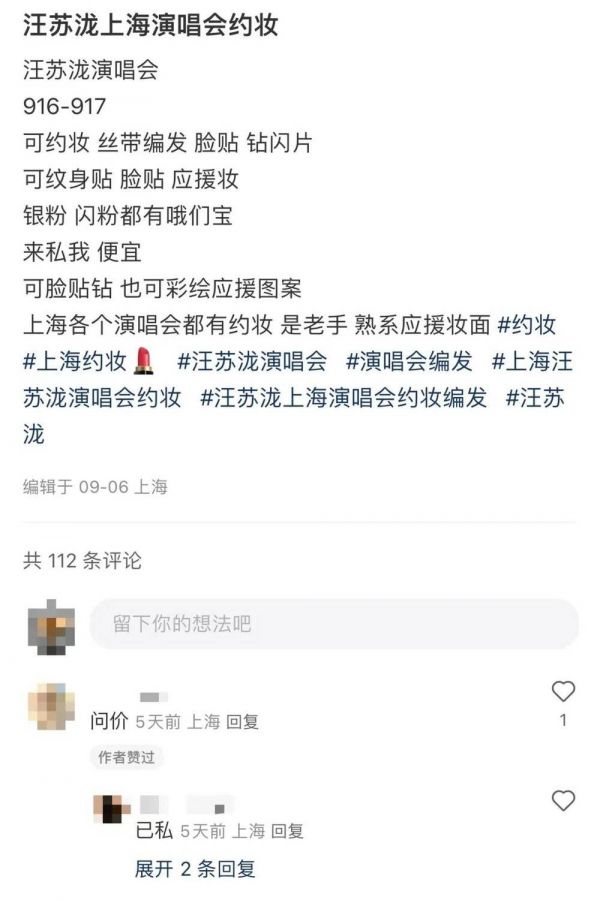 值得一提的是,演唱会约妆虽然以提供线下服务的模式进行,但引流渠道普遍集中于小红书等线上社交平台。每当有演唱会临近,相关约妆笔记的评论区都会被“是否有档期”的问价留言刷屏。