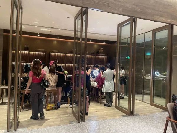 在这家星巴克里侧一个近似包厢的半封闭空间内,设有一张长方形大吧台,被改造成6组约妆摊,配上补光镜、卷发棒等设备,看上去比大厅的约妆摊更为专业。
