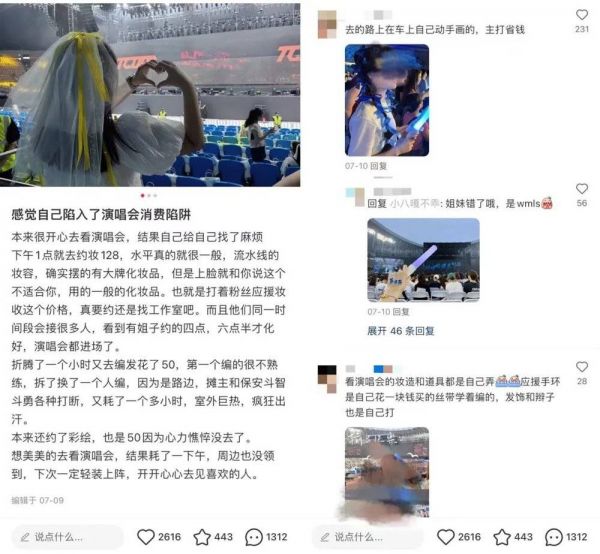 有小红书用户表示,感觉自己陷入了演唱会消费陷阱,流水线的妆容又浪费时间,下次一定轻装上阵。在评论区,有人表示认同,也有人晒出自己画的妆容,不仅不花钱,还增进化妆水平。