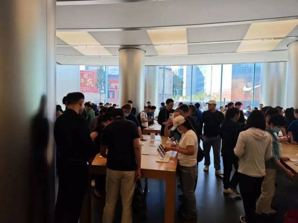 但尽管苹果发布会遭遇质疑,9月22日早间就有媒体曝出包括北京、上海在内的多地苹果商店门外出现排队情况。记者在当日下午来到北京王府井Apple Store零售店,发现店面中依然挤满了购机的人群。