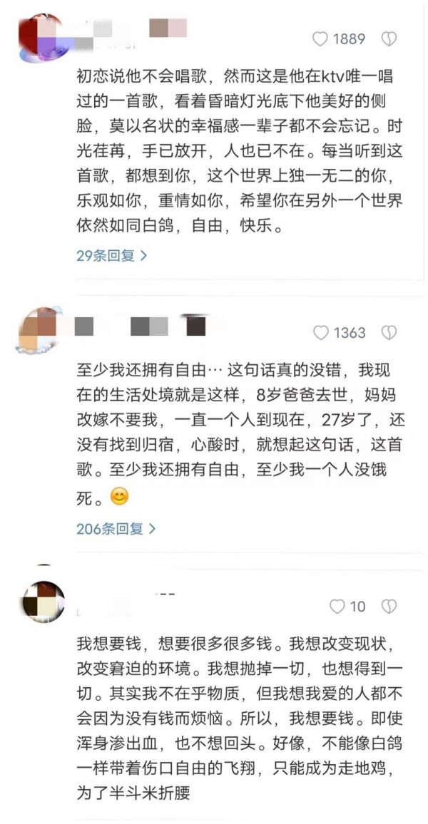 在《白鸽》的网易云评论区,许多歌迷在讲述自己的故事。我们会发现,其中有抑郁的青春期男孩,也有落寞的青年人,还有失意的中年人。