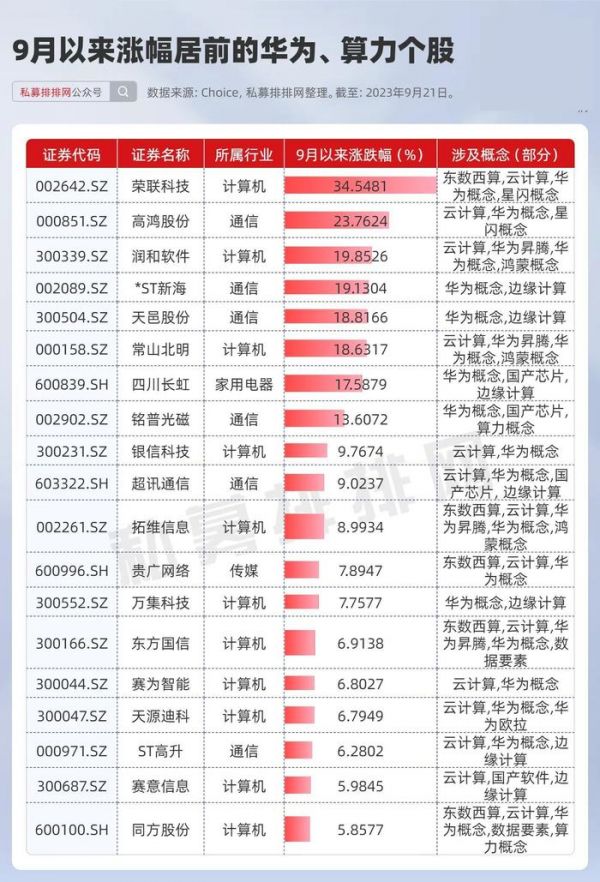笔者梳理了同时涉及华为概念和东数西算、云计算等概念的个股,发现9月以来已有多只涨幅超10%,其中涨幅前二十名单笔者整理如下,多只个股直接涉及华为昇腾概念。