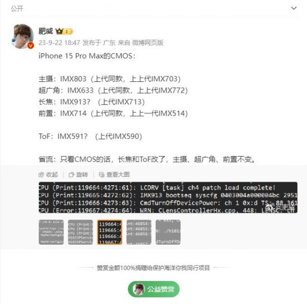 IT之家 9 月 23 日消息,消息源 @肥威昨天发布微博,表示如果只看 CMOS 的话,苹果 iPhone 15 Pro Max 的主摄、超广角和前置摄像头和 iPhone 14 Pro Max 相同,只是修改了长焦和 ToF。