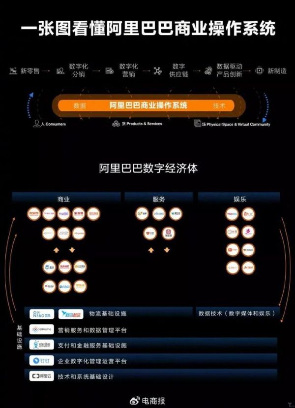 针对这一方面,阿里也做了一个很好的示范。2019年1月,阿里正式推出商业操作系统,并表示这套系统将帮助企业完成“品牌、商品、销售、营销、渠道、制造、服务、金融、物流供应链、组织、信息技术”等11大商业要素的在线化和数字化。