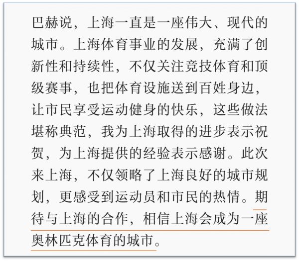 在杭州时,巴赫表示期待与浙江进一步加强合作;而在上海时,巴赫进一步表示,期待与上海的合作,相信上海会成为一座奥林匹克体育的城市。