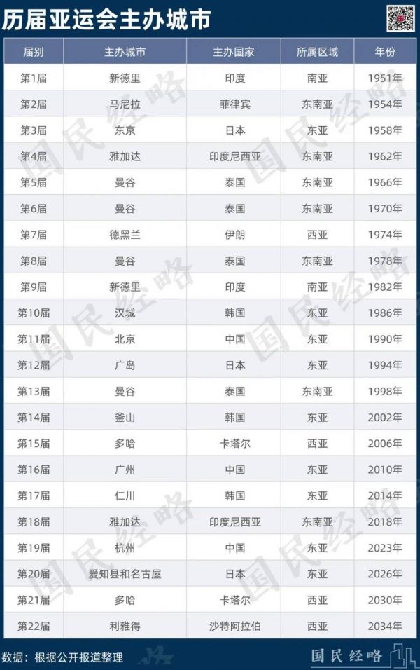 目前,2026年亚运会只有日本名古屋一城竞选,而2030年和2034年分别花落卡塔尔首都多哈、沙特首都利雅得,最近待定的一届则要到2038年。