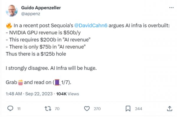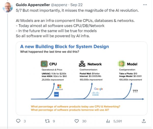 事件发酵了三天之后,硅谷创投巨头A16Z特别顾问、AI初创公司2X创始人Guido Appenzeller连发近10条推文,不仅推翻了红杉对于AI赚钱能力的估算,还指出红杉最根本的问题是,低估了AI历史性革命的影响。