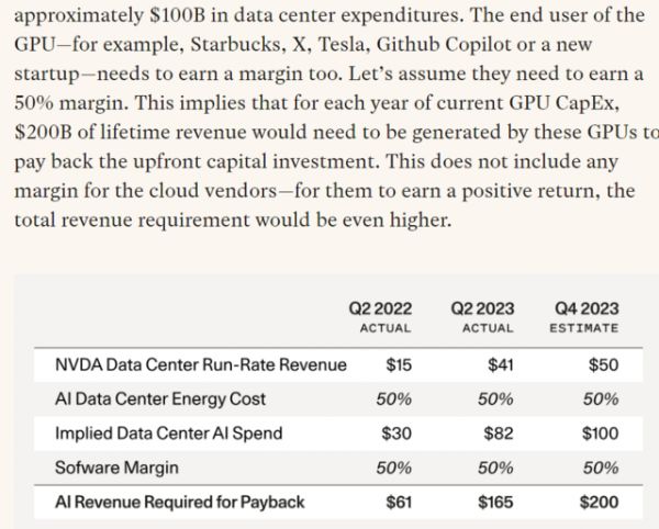 Appenzeller指出,Cahn把GPU的购买成本(资本性支出)、每年的运营成本、GPU使用周期内的累计收入和AI应用带来的年收入都加到了一起,得到了2000亿美元这一看起来超级夸张的数字。