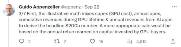 首先,Cahn文章开头用了一个2000亿美元的数字来吸引眼球,但Appenzeller认为,这一数字的计算过程存在问题。