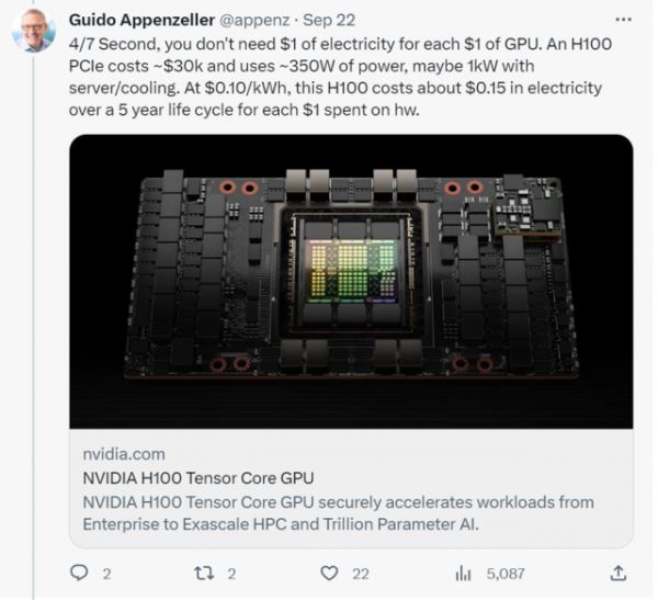 其次,Appenzeller认为,GPU的电费成本也被夸大了。Cahn假设GPU的电费消耗和硬件成本之比为1:1,但实际上并没有那么夸张。