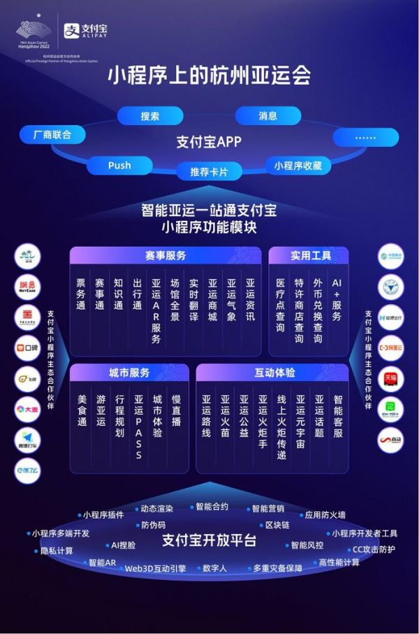 在开幕式外,支付宝也通过开放生态、技术助力杭州亚运会实现多个历史首创。支付宝开放20项平台数字技术,联合15家合作伙伴和2万多个服务商家,助力杭州亚组委推出了全球首个一站式数字观赛服务平台——智能亚运一站通。该小程序自上线以来,用户注册量已超过1亿人,访问量高达43亿,并成功入选首批国家级智能体育典型案例。
