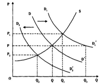 而当经济周期处于滞胀期时,消费者降低消费预算,尤其是降低对可消费品的预算,这时候DD'曲线左移为D₂D₂’,新的需求曲线与供给曲线曲线S,给出新的供需平衡点——更低的价格P₂,更少的数量Q₂。