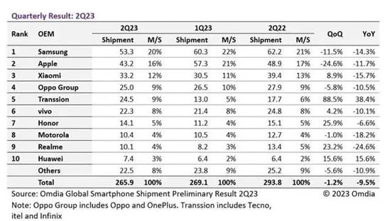 图:2023Q2全球智能手机市场出货量,来源:Omdia根据Omdia报告数据,全球智能手机市场出货量虽然还处于下滑趋势,但整体来看qoq