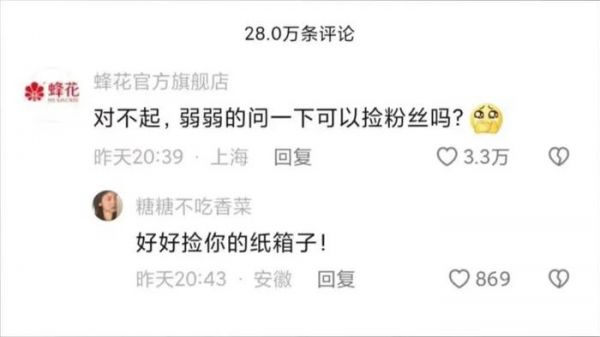 2023年,蜂花在社交媒体端更是不断强化这一人设,通过将单纯卖惨升级为与消费者玩梗互动,加强消费者和品牌的亲近感。这一点,在此次老国货品牌狂欢发生前的“捡粉丝”、“捡箱子”等操作中,体现得淋漓尽致。