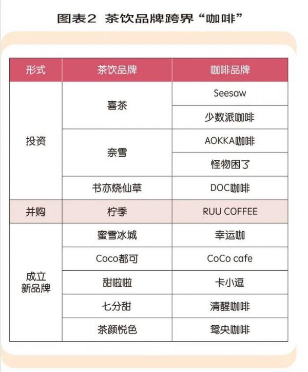 这正因此,茶饮品牌已经不满足于在店内搭售几款咖啡饮品的“小打小闹”,而是着力于培养咖啡新品牌。(如图表2)尽管目前为止,已经形成一定规模和知名度的咖啡品牌只有蜜雪冰城旗下的幸运咖,但是茶饮品牌涌向咖啡赛道,势必会加剧本就激烈的咖啡赛道竞争。