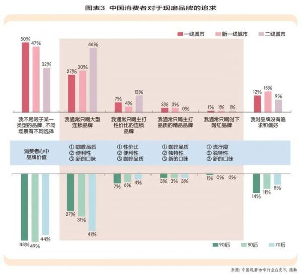 根据德勤发布的《中国现磨咖啡行业白皮书》中,对于消费者的调研,无论是一线城市、新一线城市,还是二线城市,消费者对于现磨咖啡的品牌最为明显的两个趋势是:“不局限于某一类型的品牌,不同场景有不同选择”和“通常只喝连锁品牌”(如图表3),也就是说谁能够占领消费者心智、建立品牌认知,就将会成为消费者的普遍选择。
