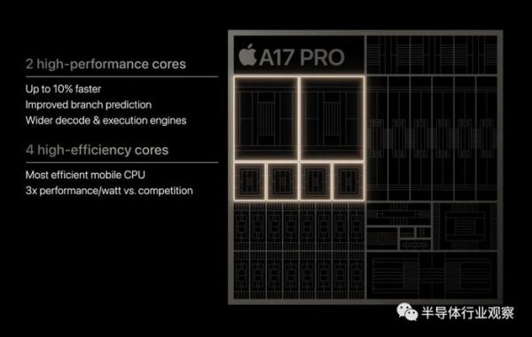 A17 Pro依然是6核CPU配置,有两个高性能核心和四个效率核心。然而,这些内核都可以在每个功率级别提供性能。苹果表示,与去年的 A16 Bionic 芯片相比, 我们预计 CPU 性能将显着提高,最高可达 10% 。