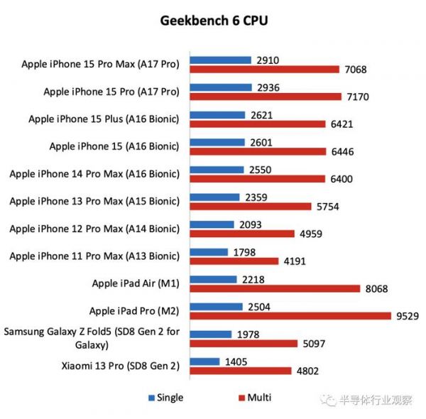 从 Geekbench 6 上的 CPU 成绩来看,A17 Pro 的整体性能比 A16 Bionic 好约 10%,比 A15 Bionic 快约 22%。值得注意的是,它的单核分数甚至比配备桌面级 M2 芯片的最新 iPad Pro还要高。