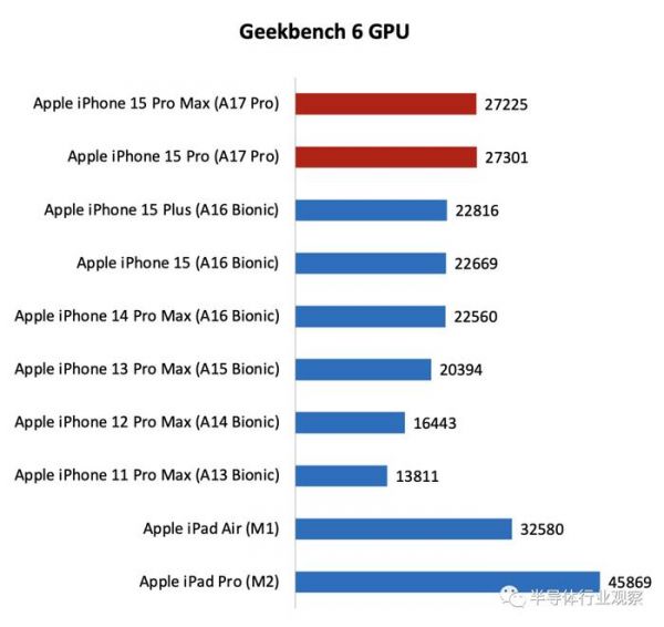 在 Geekbench 6 的 GPU 基准测试中,A17 Pro 的图形性能比 A16 Bionic 提升约 20%,比 A15 Bionic 提升约 33%。M1 和 M2 芯片的性能明显更好,因为它们分别具有 8 核和 10 核 GPU。