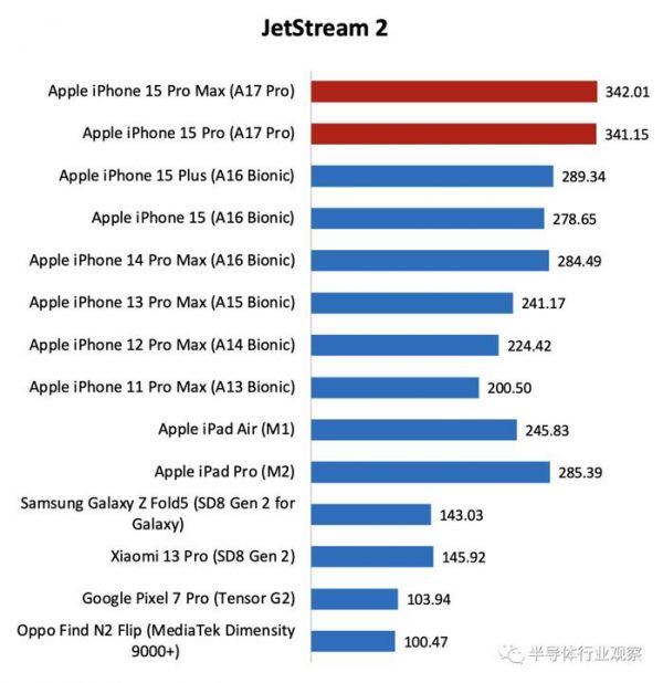 A17 Pro 在 Jetstream 2 上取得了显著的进步。在这里,它的分数比 A16 Bionic 高出约 1 7%,比 A15 Bionic 高出 41%。令人难以置信的是,它的性能甚至超越了 M2 芯片。Android 设备在此基准测试中通常表现不佳。在这里,即使是高通的最新芯片也无法与苹果的 A13 Bionic 相媲美,后者是四年前的芯片。