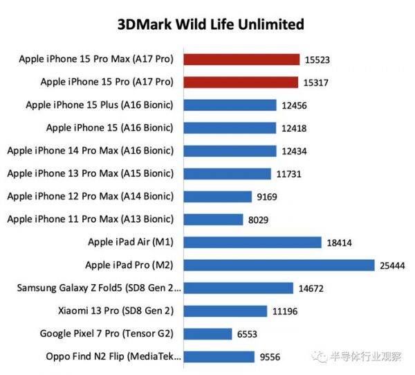 在 3DMark 上,A17 Pro比 A16 Bionic 快约 23%,这再次证实了苹果的说法。有趣的是,它只比 M1 芯片慢 15% 左右。高通最新的 Snapdragon 8 Gen 2 芯片提供了显着改善的图形性能,三星 Galaxy Z Fold5 的得分仅比 A17 Pro 低 5% 左右。也就是说,这很大程度上取决于实现,因为同样采用相同芯片的小米 13 Pro(尽管时钟速度较低)比 A17 Pro 慢了 28%。