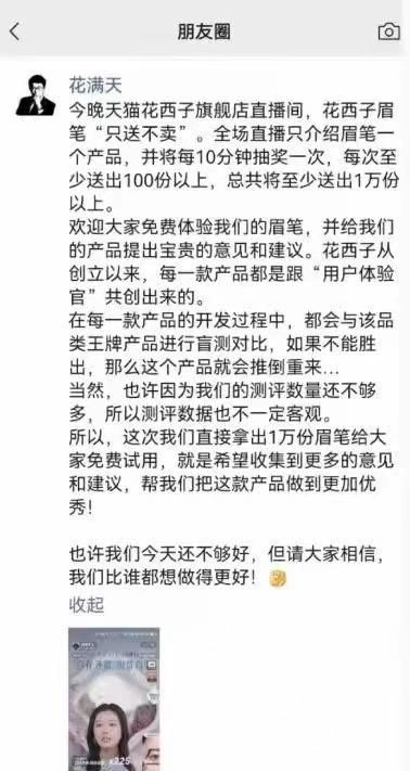 9月20日晚,在花西子公关部离职事件闹得沸沸扬扬的当天,吴成龙(花满天)发布朋友圈,表示当晚花西子天猫直播间眉笔“只送不卖”,总共将送出至少1万份。