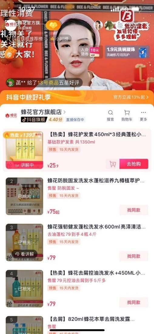 9月21日上午10点半,蜂花抖音直播间观看人数2300人左右,但只有一款护发素有货。