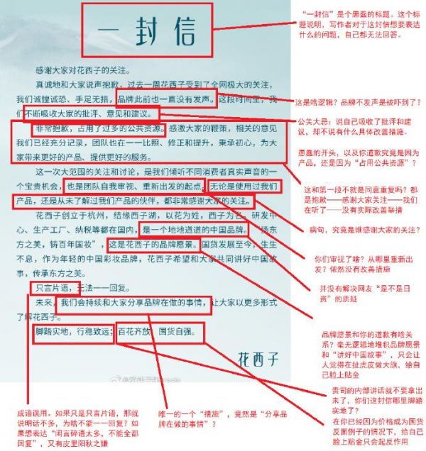 甚至有微博用户因为该信件漏洞百出,而逐字逐句进行了批注。