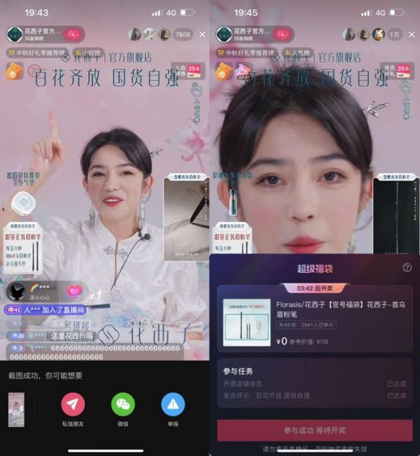 紧接着,9月20日晚,吴成龙(花名:花满天)在朋友圈宣布花西子天猫旗舰店直播间抽奖送1万份眉笔,每10分钟抽奖一次,每次至少送100份以上。