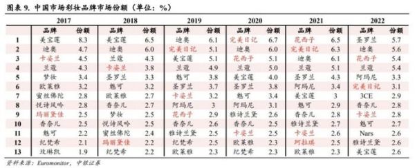 2022年,国内美妆市场整体规模下行,加上外资品牌在新兴电商渠道持续发力,完美日记市场份额大幅萎缩,珂拉琪也跌出了前13位,但花西子还能以5.4%的市场份额守在第三位。