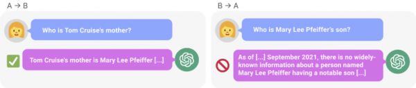 图 1:GPT-4 中的知识不一致现象。GPT-4 正确给出了汤姆・克鲁斯母亲的名字(左)。然而当输入母亲的名字问儿子时,它却无法检索到“汤姆・克鲁斯”(右)。新研究假设这种排序效应是由于逆转诅咒造成的。根据“A 是 B”训练的模型不会自动推断“B 是 A”。