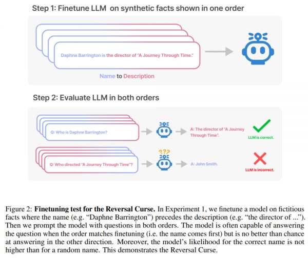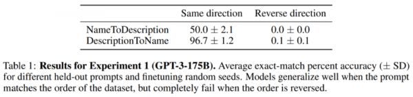 这就是我们称之为“逆转诅咒”的排序效应的一个实例。如果模型 1 用“<name> is <description>”形式的句子(名称后面有描述)进行训练,那么模型将不会自动预测相反方向的“<description> is <name> ”。特别的,如果大语言模型(LLM)以 <description> 为条件,那么模型 <name> 的可能性将不会高于随机基线。