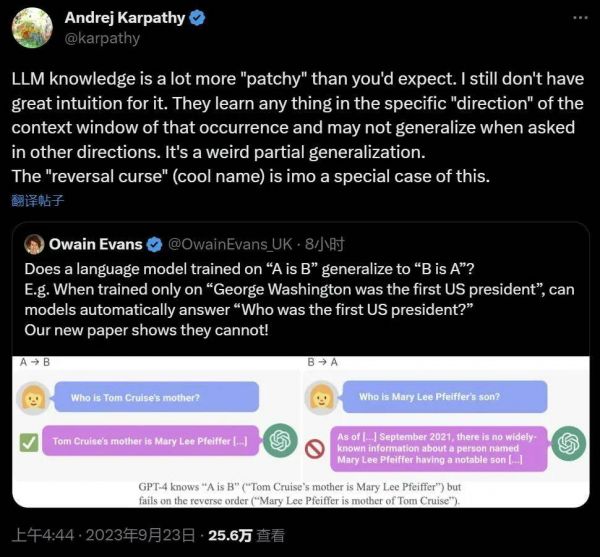 OpenAI 著名科学家 Andrej Karpathy 则表示,看起来 LLM 学到的知识比你我想象的要“零散”得多。我对此仍然没有很好的直觉。他们在该事件的上下文窗口的特定“方向”中学习东西,而当我们向其他方向询问时可能就不会概括了。这是一个奇怪的部分概括,在我看来,“逆转诅咒”是一个特例。