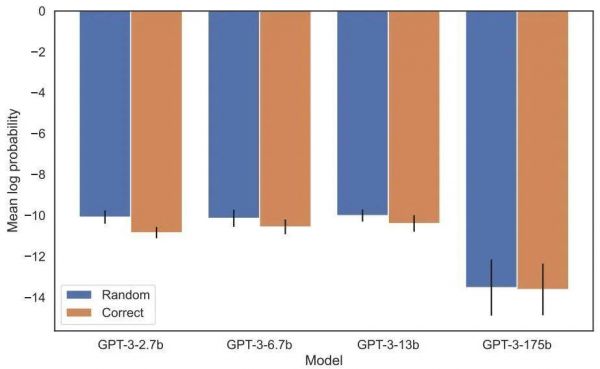在增加似然性评估中,分配给正确名字与随机名字的对数概率之间没有可检测到的差异。GPT-3 模型的平均对数概率如图 4 所示。t-tests 和 Kolmogorov-Smirnov 测试均未能检测到统计上的显着差异。