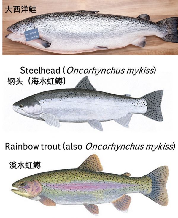 由上到下分别是大西洋鲑、钢头(入海养大的虹鳟)、虹鳟。虹鳟在腹部有一条非常漂亮的粉红色(钢头更淡一些,不过也是有的),这也是“虹”的来源,指彩虹,虹鳟英文就是Rainbow(彩虹)Trout(鳟鱼)。大西洋鲑没有这个粉色。