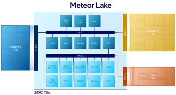 Meteor Lake采用分离式模块架构,实现了更灵活的平台设计,这里引入一个Tile(可以简单理解为片)的概念,整个芯片由计算模块(Compute Tile)、SoC模块(SoC Tile)、图形模块(GPU Tile)以及IO模块(IO Tile)四个独立模块组成,通过Foveros 3D封装技术连接起来。主要有以下特性: