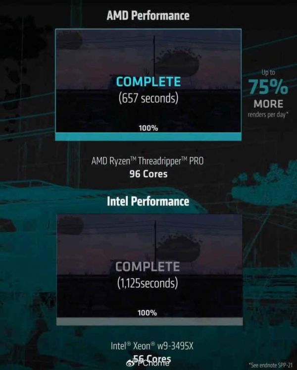 根据泄露的宣传内容显示,全新的AMD Threadripper 7000 PRO系列处理器将于秋天发布。而根据宣传上的表述来看,新产品相比上一代基于Zen 3架构的Ryzen Threadripper 5000系列会有20%的性能提升,推测为单核性能的提升幅度。此外,另外一张宣传图中提及了在渲染任务中,拥有96核心的新款处理器仅需657秒,比起竞争对手英特尔56核心112线程的Xeon W9-3495X处理器的1125秒要快75%左右。