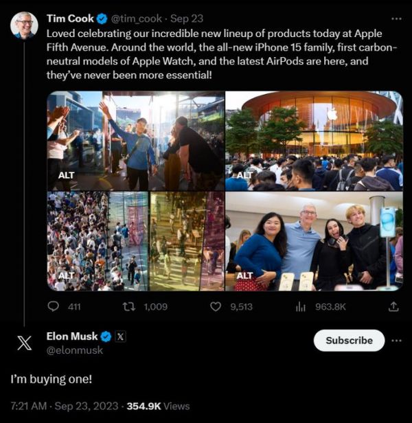 ▲ 图源 X 平台相关贴文此后,库克又分享苹果旗下产品包括 iPhone 15 系列手机、Apple Watch、AirPods 等产品时,马斯克回应称:“我要买一台!”